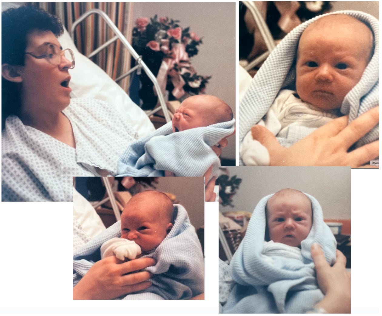 My son’s foot was stuck up in my stomach, so while the doctor literally grabbed my abdomen and turned the baby’s direction from the hip, I grabbed the foot and pushed mightily. Finally, he headed on out! We joke to this day about trusting our son’s sense of direction. Anyway, given his stressful journey, they put him right on oxygen, which seemed to help after a few minutes.
