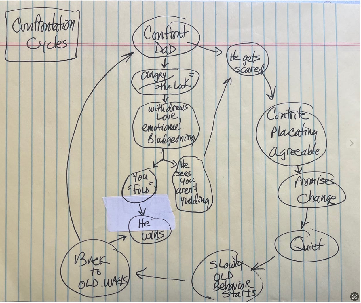 Also, about that same time, I learned that he had not been to a counselor like he said he would. He brushed it off by saying that he and my mother had gone to see a priest. Who knows if that was even true? And even if they did, to my mind, that was a useless substitute for treatment by a mental health professional for deeply ingrained abusive behavior.