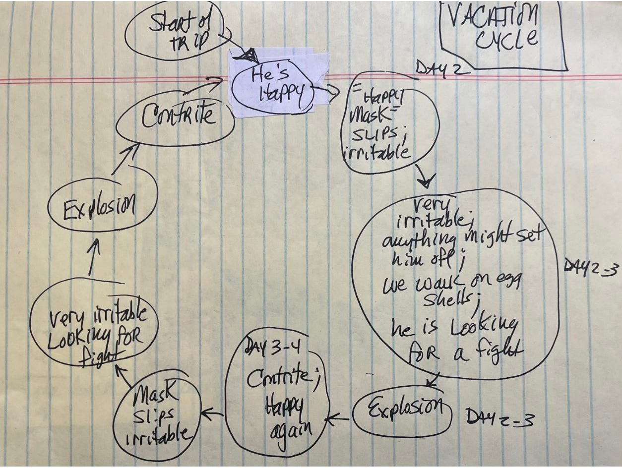 Dad’s behaviors, when I look back, show up as an unchanging pattern of cycles. For example, whenever we went on vacation, the first day was wonderful. He was happy, relaxed, and we were excited. But within the next 24-48 hours, that mood would slip, his irritability would rise, we would walk on eggshells more and more, until the inevitable explosion would take place. Then he would be contrite, calm, and happy, and the rest of the cycle would start again.