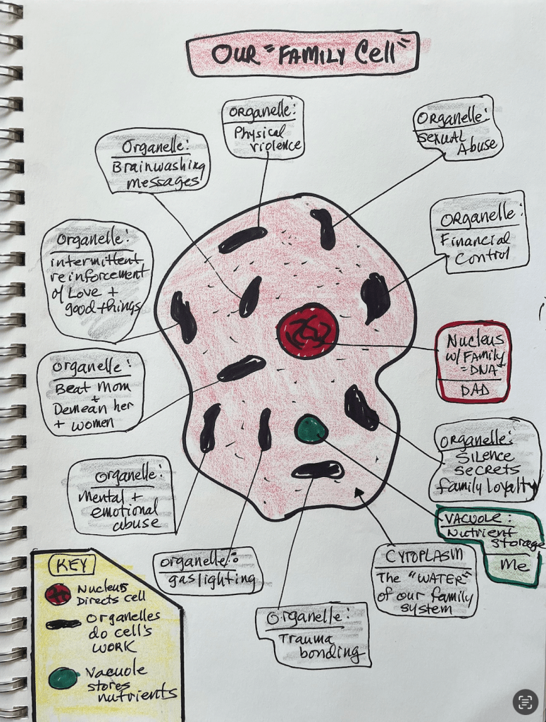 I remembered doing those diagrams in sophomore high school biology, of the cell and its internal components — a nucleus, the boss that directs the cell, various organelles to perform the cell’s metabolic functions, and storage vacuoles to hold nutrients for the cell. I suddenly saw my Time with Dad in those terms, with the various organelles he used to control our household — things like violence and sexual abuse, the confusing mix of brainwashing and gaslighting, trauma bonding, and so many others.