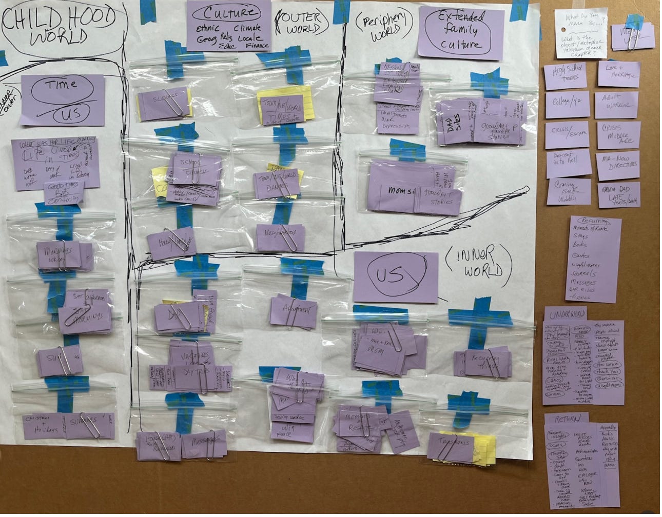 So, I resorted to what I always do when confronted with too much information: I throw everything I can think of onto a large sheet of paper to see it all at once. That way, I can then notice if there are key pieces that stand out — relationships, patterns, repeating elements.