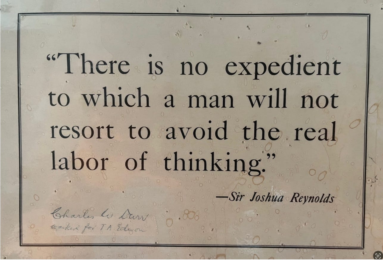 He shared several stories from “those days,” and then pointed to a framed sign, copies of which were hung all over the buildings at Edison’s insistence — a way to communicate Edison’s work ethic to his employees. It was a simple sign, with a quote by someone named Sir Joshua Reynolds. While I didn’t know who he was, the quote intrigued me, and I ended up buying a copy of it from the gift shop — I ALWAYS bought something from science museum gift shops. Or picked up a piece of coal or rock, or something from these places as my souvenir. But after buying the sign, I went back and had Mr Durr autograph mine: “Charles W. Durr, Worked for TA Edison.” That sign still hangs on my wall. And these days I also pay close attention to its meaning: