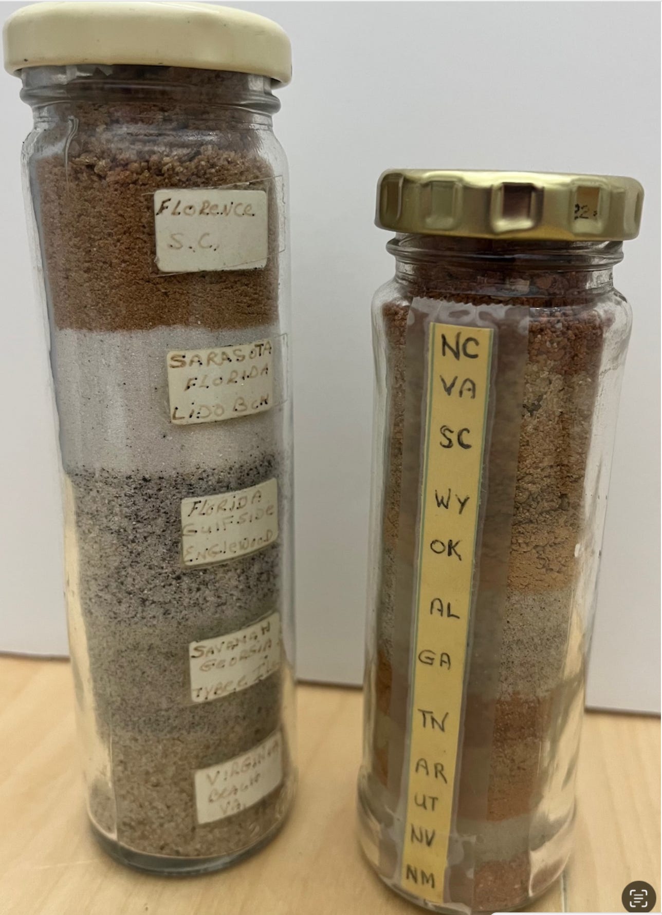 But Dad? He was always pushing himself…and us…to keep growing. One summer, he made us learn to write business letters and then write to the Departments of Agriculture in many states to ask for soil samples so we could learn that the geology and science of each place was different. Some states actually answered us and sent samples, which he took and layered in tall, narrow jars labeled with the names of the state that sent the sample. I still have those jars, and I have to admit it *was* cool to see the regional differences. Dirt is not just dirt.