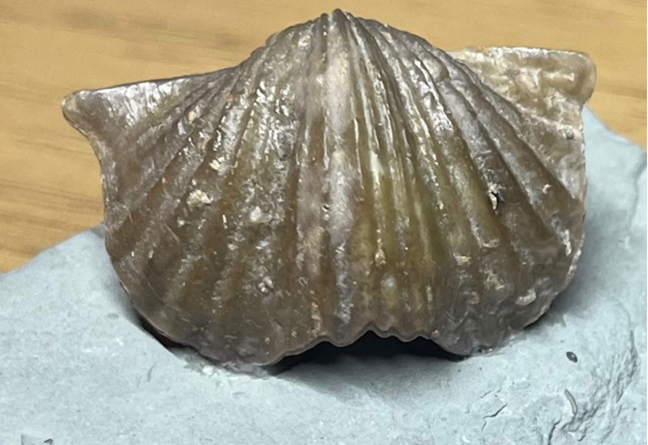 We spent one vacation day of his driving to the middle of the state and down a dirt road to an abandoned quarry that was now a pit that “rockhounds” — amateur geologists — could pay a small fee and climb all over looking for rocks and minerals. My Mother sat in the car, angry, but I loved it. We had quite a rock collection, and I learned early to identify the differences between slate and mica, garnets and quartz. There were also lessons on fossils, though to this day I am not impressed by dinosaurs and those show-off T. rexes. I have always been drawn to the unusual, the small and overlooked, the things living in the background. My two favorites are small sea creatures — one called a brachiopod, and the other, a trilobite, an ancient relative of the modern pillbug.
