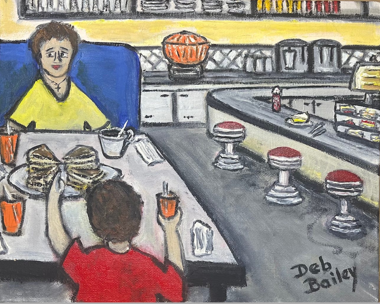 It was always the same thing — we’d order one turkey club sandwich, cut into four sections, and each of us would have a section. And then a soda or milkshake, and sometimes ice cream. I loved watching the orange soda dispenser — a large glass squarish globe on top of the dispenser section. It was truly a soda “fountain” because the orange liquid would circulate in the container, shooting up the center and then flowing down the sides.