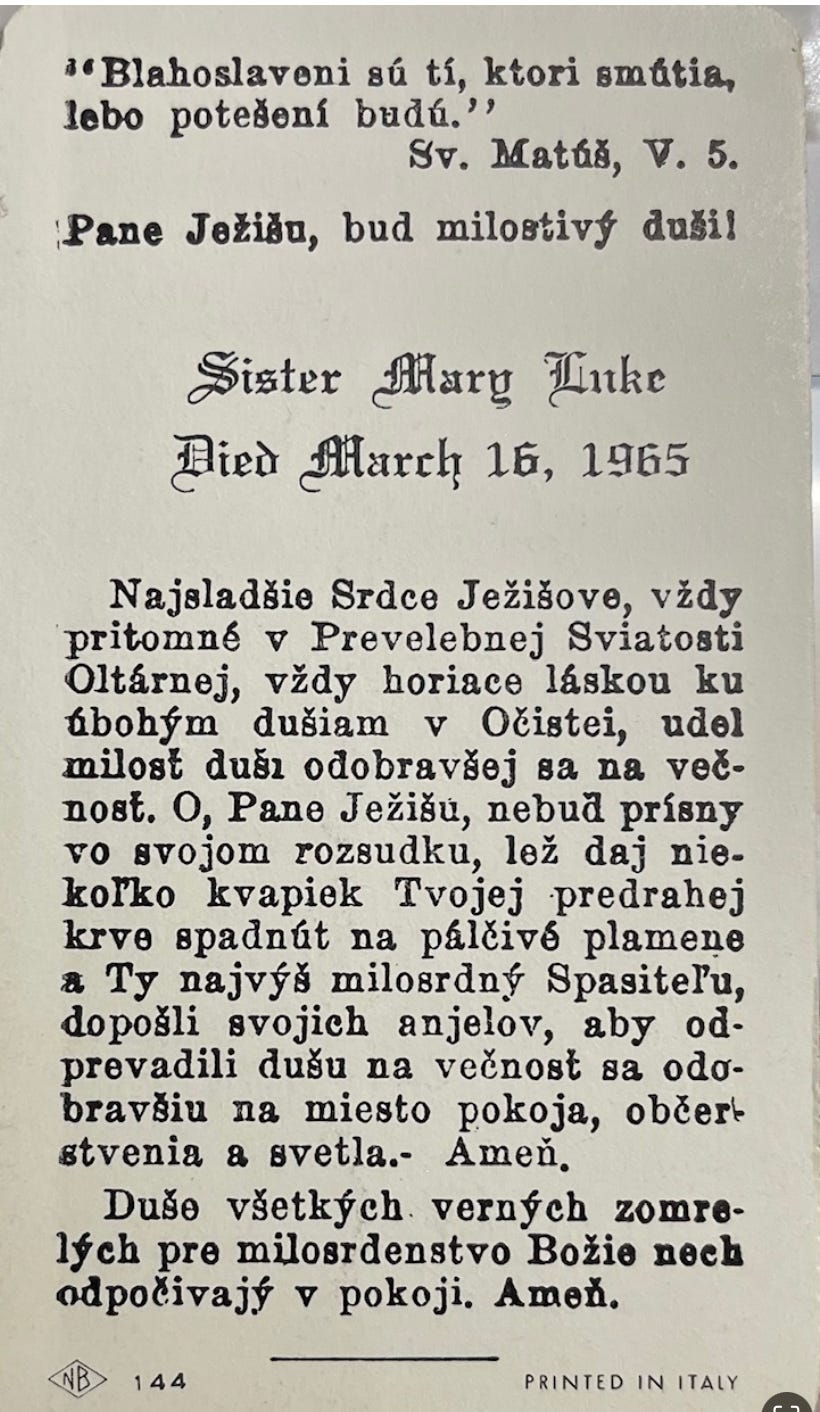 I was young at the time, too young to attend the funeral in PA. We stayed with a family friend while my parents and grandparents drove down for her funeral, but even though I was young, I was aware that this death took Mom a long time to get over. I was given one of the prayer cards from the funeral, though, and even as it was all in Slovak, I kept it in my box of treasures.