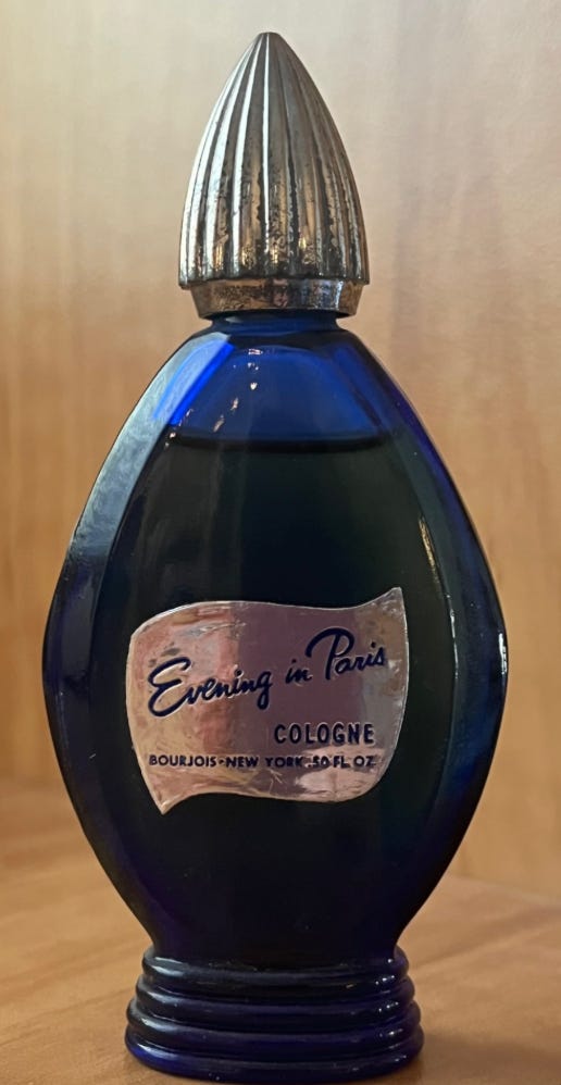 I also remember her sense of style — gloves, pillbox hats that were the vogue then, heels that matched the outfit, and her colognes – Chanel No. 5, and Evening in Paris. Even now, I have a small bottle that I don’t use; I just crack it open now and then, inhale the sweet aroma, and feel Mom next to me.