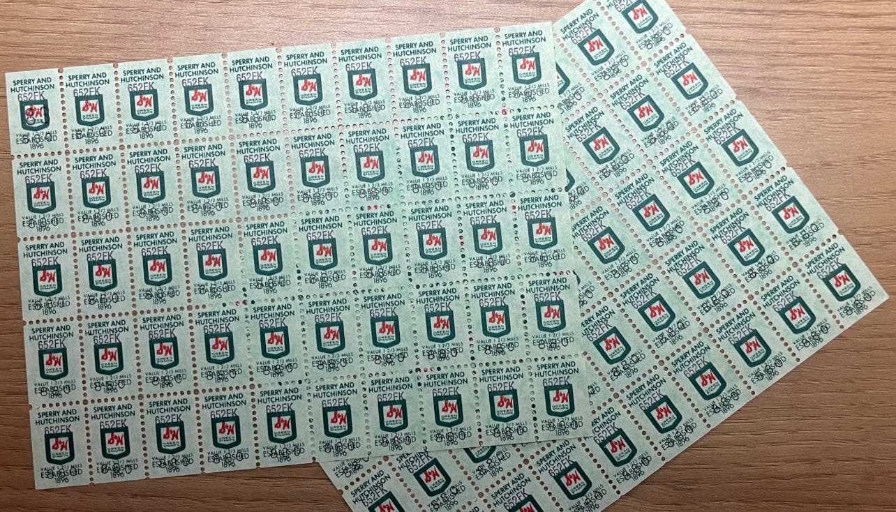 Occasionally, we’d go to the S&H Green Stamp store. That usually required advance preparation and planning, though, because you had to have your stamps all glued into the books ahead of time, and then when you knew how many books of stamps you had, you could figure out what items to cash them in for. It was always exciting to see what we might be able to choose from the catalog.