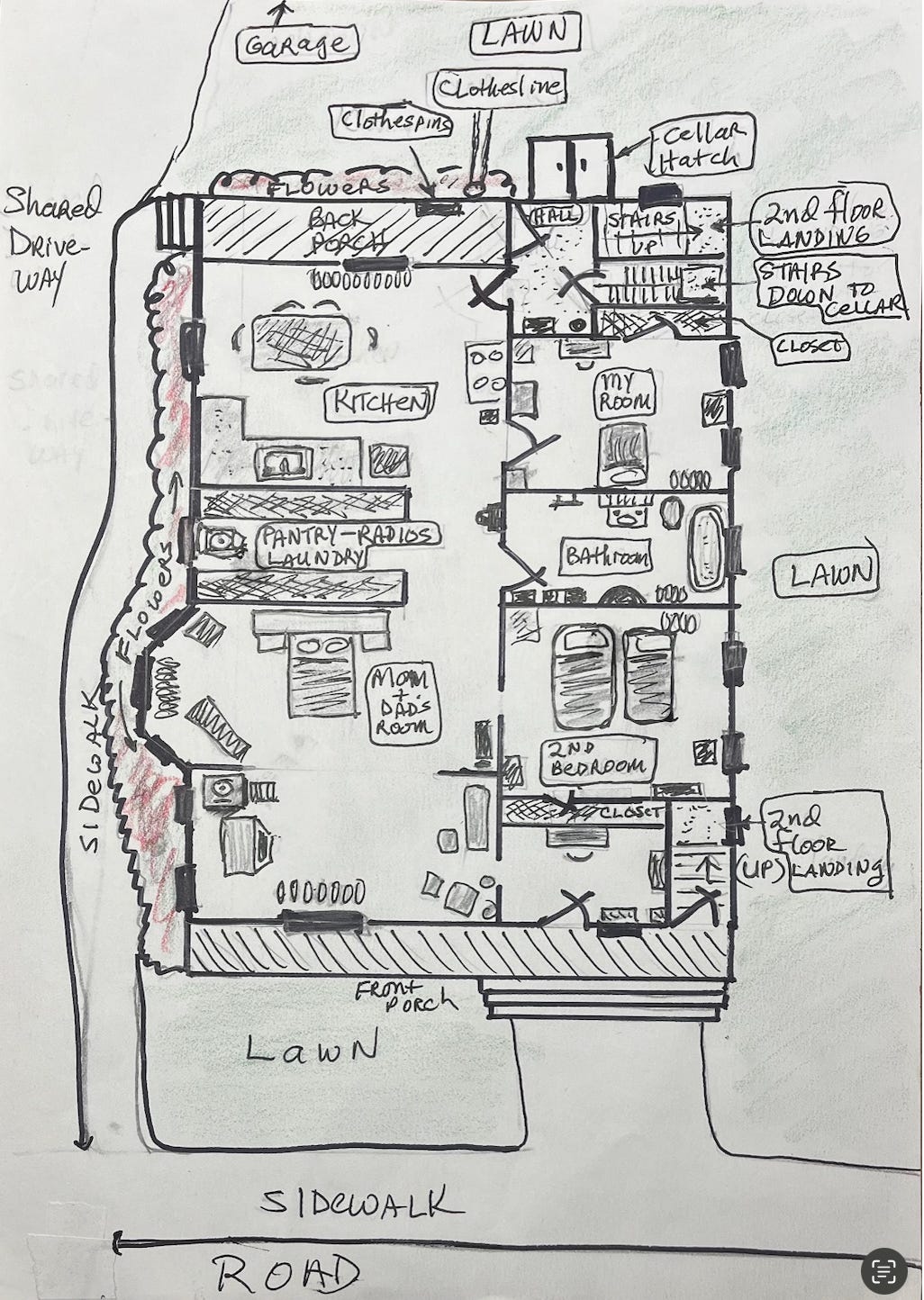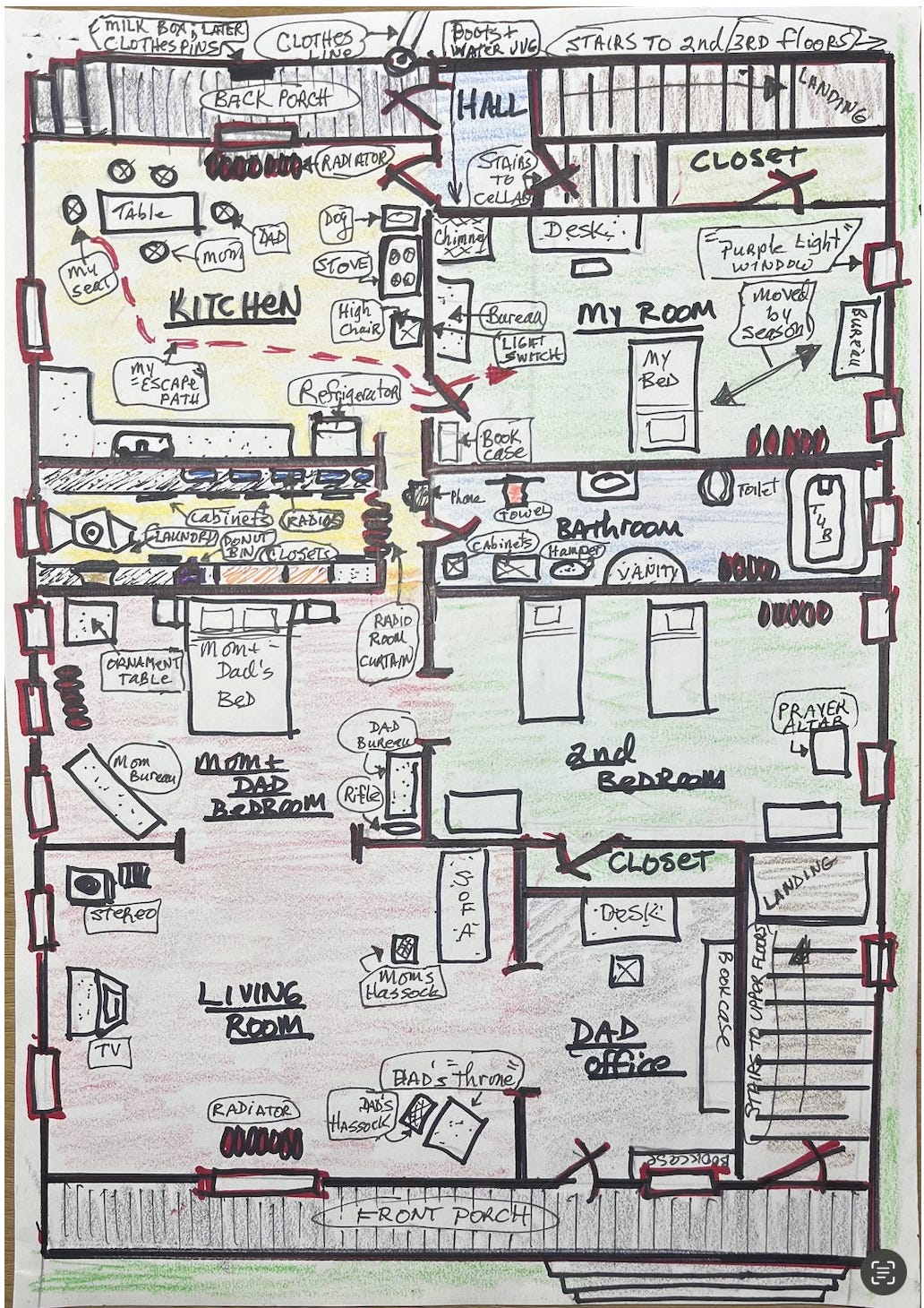 Some notations — such as “my Escape Path,” the “Purple Light” window, and why my bed moved by seasons — will be explained in better detail later. I’ll also share more later about all the places I lived out my daydream adventures — the garage, yard, neighborhood, and, of course, the scary, fascinating, and questionably haunted cellar beneath our house. But regarding the map below, it is clear our apartment was very specifically arranged, and it had better stay that way. It is symbolic of the “culture of our life behind closed doors.”