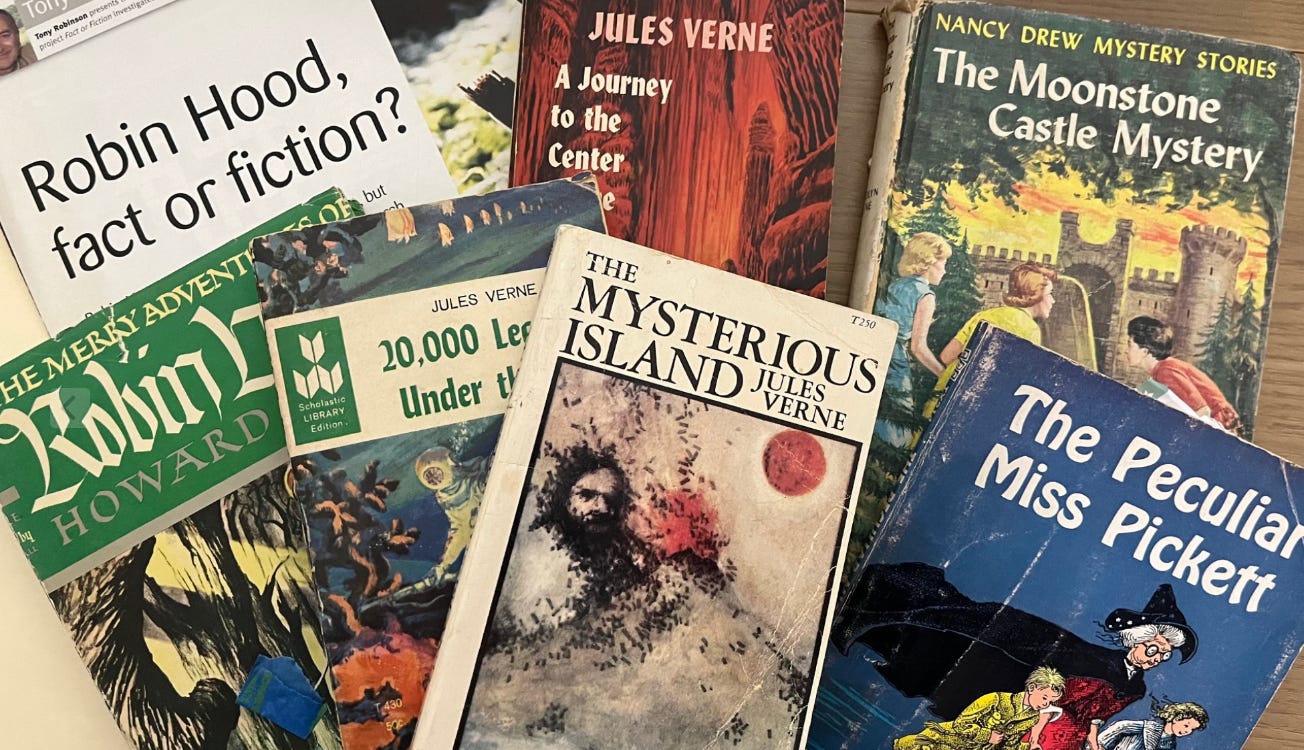 At the other end of the spectrum were adventures in Sherwood Forest with Robin Hood or Ivanhoe, riding a magic carpet with The Peculiar Miss Pickett, or solving any number of mysteries with Nancy Drew. And I was not patient in those books whenever they took time to talk about parties or dresses. I wanted action and to keep the mystery moving.