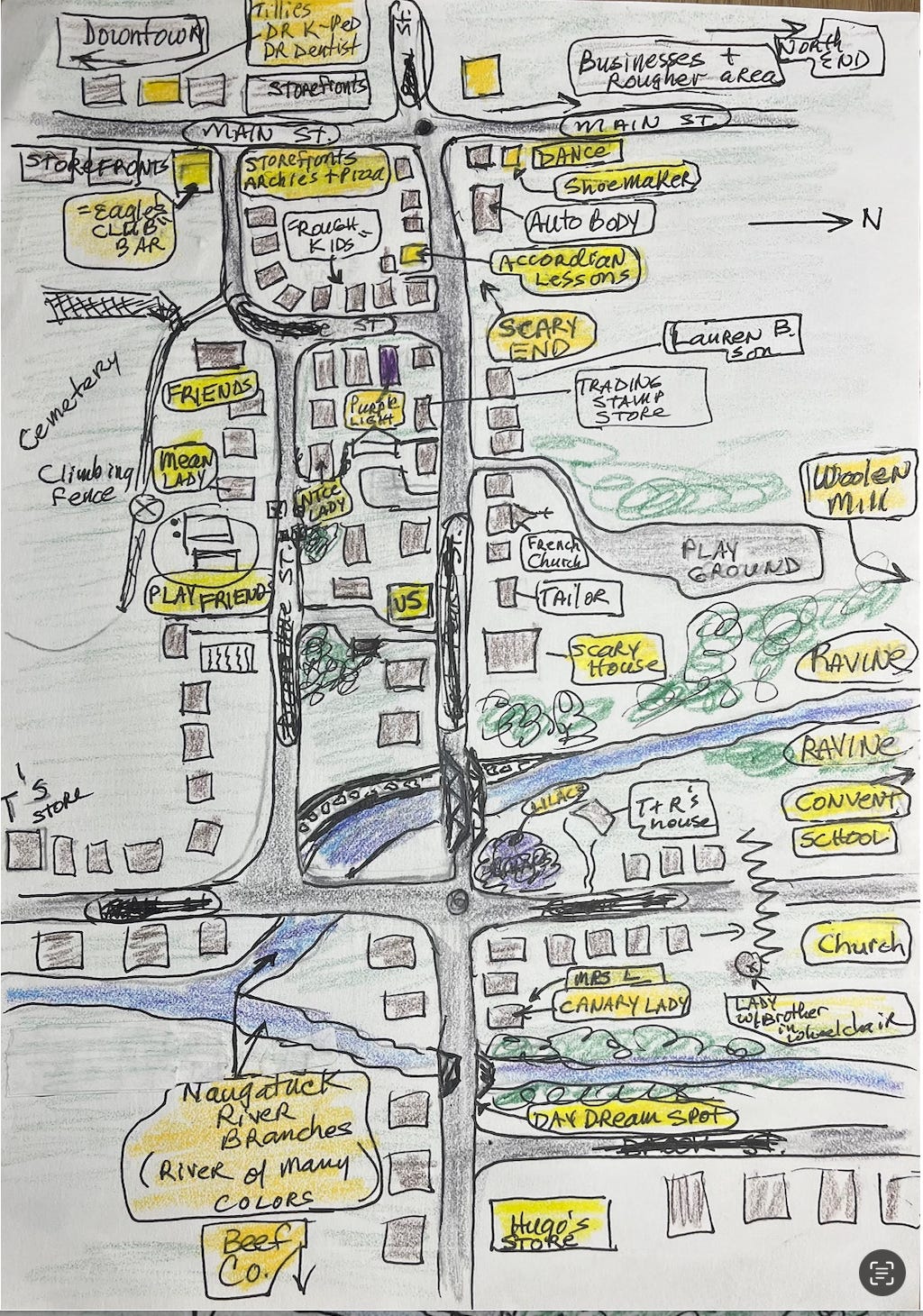 There was the French church up our street that really wasn’t a church anymore, and someone converted it into a home. That was right near the 2-family home that Lauren Bacall’s son lived in for a while. And then there was the scarier northern end of our street, where the auto body shop was, along with the street with “the rough kids” that we knew to avoid, and some industrial buildings that were just creepy and seemed abandoned. Of course, there was the scary house across the street from us in front, the river, and Hugo’s store next to my “daydream spot” by the brook. So many of the things in my world, from our dance class studio to our hairdresser’s, from our pediatrician to the storefront for my accordion lessons, everything was right there and within walking distance.
