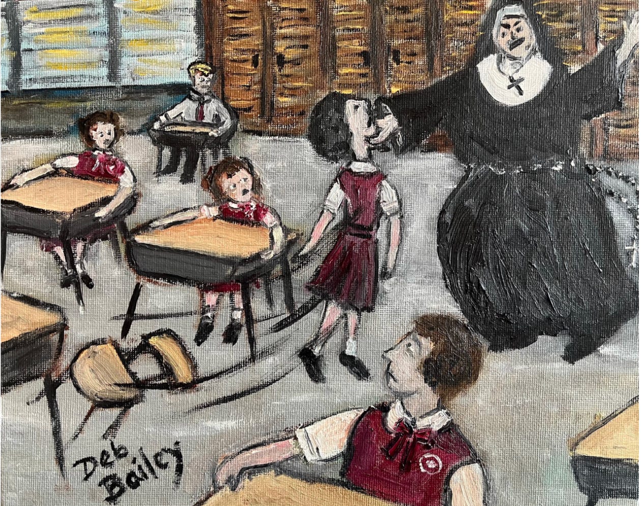 The rest of us were in shock when she hit him because no nun had EVER even yelled at him. So, he was probably the most traumatized of all, because he wasn’t used to that. The rest of us had received enough physical punishment to know how to absorb it. But when he got hit, he turned beet red, started coughing, and nearly choked.