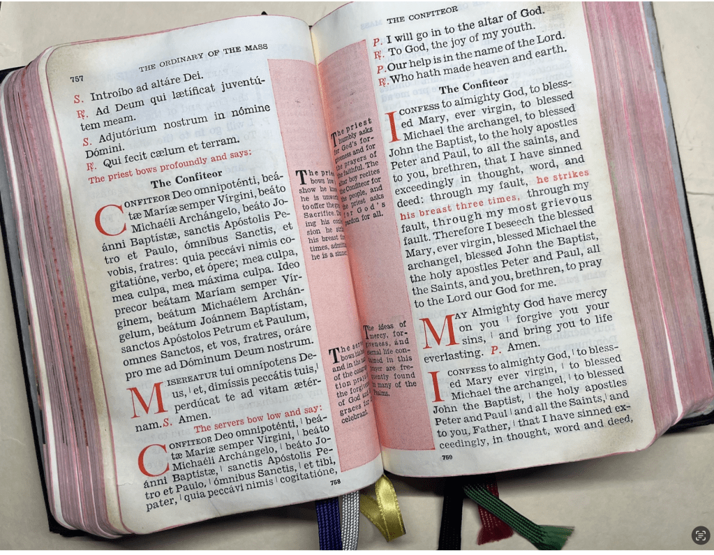 As Mass continued, I’d sit there with my Missal — a Catholic prayer book on steroids — trying to match up the Latin-word page on one side, with the English-word side on the other. In those moments, I felt God and reveled in it. It was me, and God, and no stress.