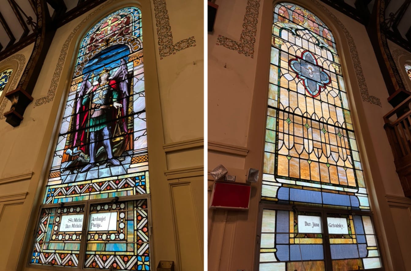 As to the windows, on both sides of the church, 3-story-high stained glass windows lined the walls. They were beautiful and each one was different. I still remember the holy-warrior-like, St.Michael the Archangel on one, and another with the bluish base that reminded me of a jelly jar. It never occurred to me to question why St. Michael was an “archangel” — a higher-ranked angel than all the others. He just was. And he was a warrior…unlike the Archangel Gabriel, who delivered messages to Mary and others. The bottom panels of all the windows had names in Slovak of the people who had donated the money for them.