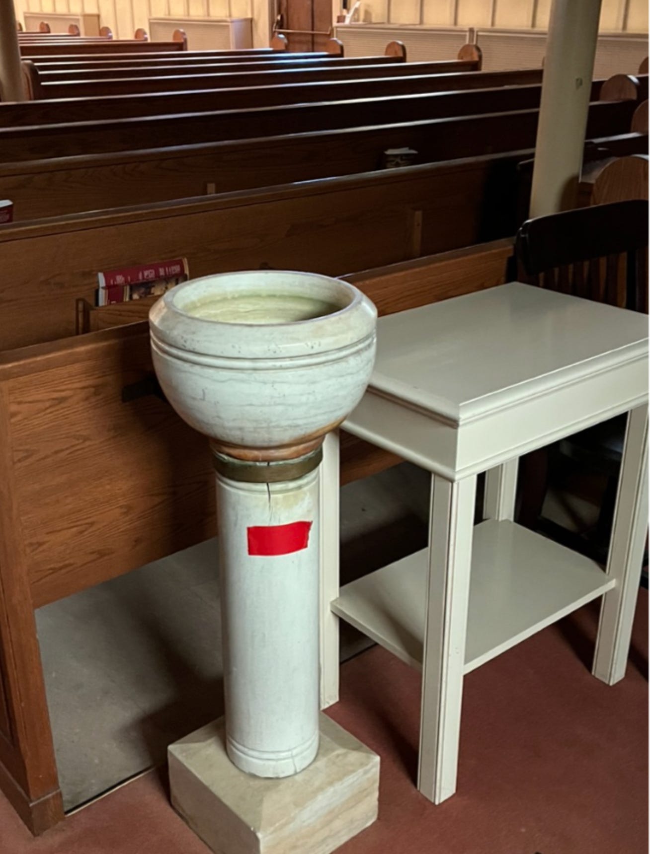 In one corner of the vestibule, there was a stainless steel cylinder filled with holy water. It had a small spigot at the bottom so people could come and fill their own bottles for home.  All good Catholic families knew to have some on hand at home for emergencies. Sickness, maybe? Death? Bad things? I just knew you should always have some on hand. Rules that you embraced. It’s like when the priests came around every January to bless homes. They would come in with their garments, holy water, and a red crayon. They’d say prayers of blessing, sprinkle holy water on the door, then mark the top of the doorframe in crayon with the date and the initials of the three kings. You just embraced it as part of normal life.
