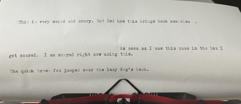 When I put my hands on it, it’s amazing how tactile memory takes you right back to that moment in time when I received that first typewriter. Closing my eyes, I just rested my fingers on the keys. Slid them over the letters. Hit the space bar. Yanked the carriage return handle. It all came back. How to lock the carriage. Backspace. Change the ribbon. I was in heaven.