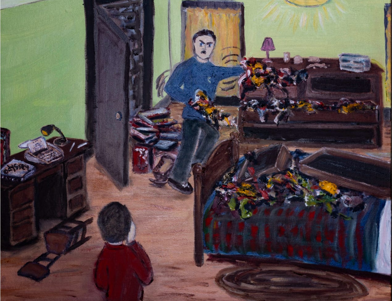 I would just start to calm down when I’d hear him returning. Again and again we went through rounds of this, each time my nerves fraying more. Finally, he would decide it was time to escalate the situation, and he would come into my room. He’d whip open the closet door and start yelling about the mess in there with all of our shoes and toys.