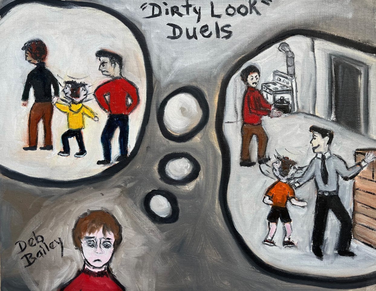 So supper was almost always the duel of the dirty looks — my family’s name for angry glances. I was going to get them from one parent or the other, and it just came down to which one did I risk on any given day.