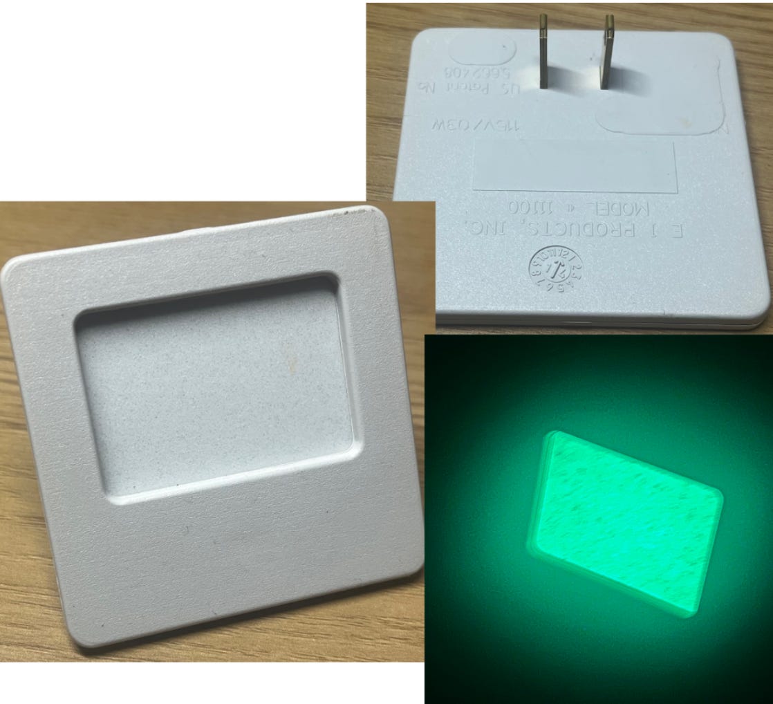 Have you ever had one of those simple green night-lights? They’re nothing special and very inexpensive. You just plug them in and forget them. When the room is dark, they’ll emit a subtle, green glow, just enough to keep you from walking into a wall or stubbing your toe on a door. And I find myself deeply at peace in its presence.