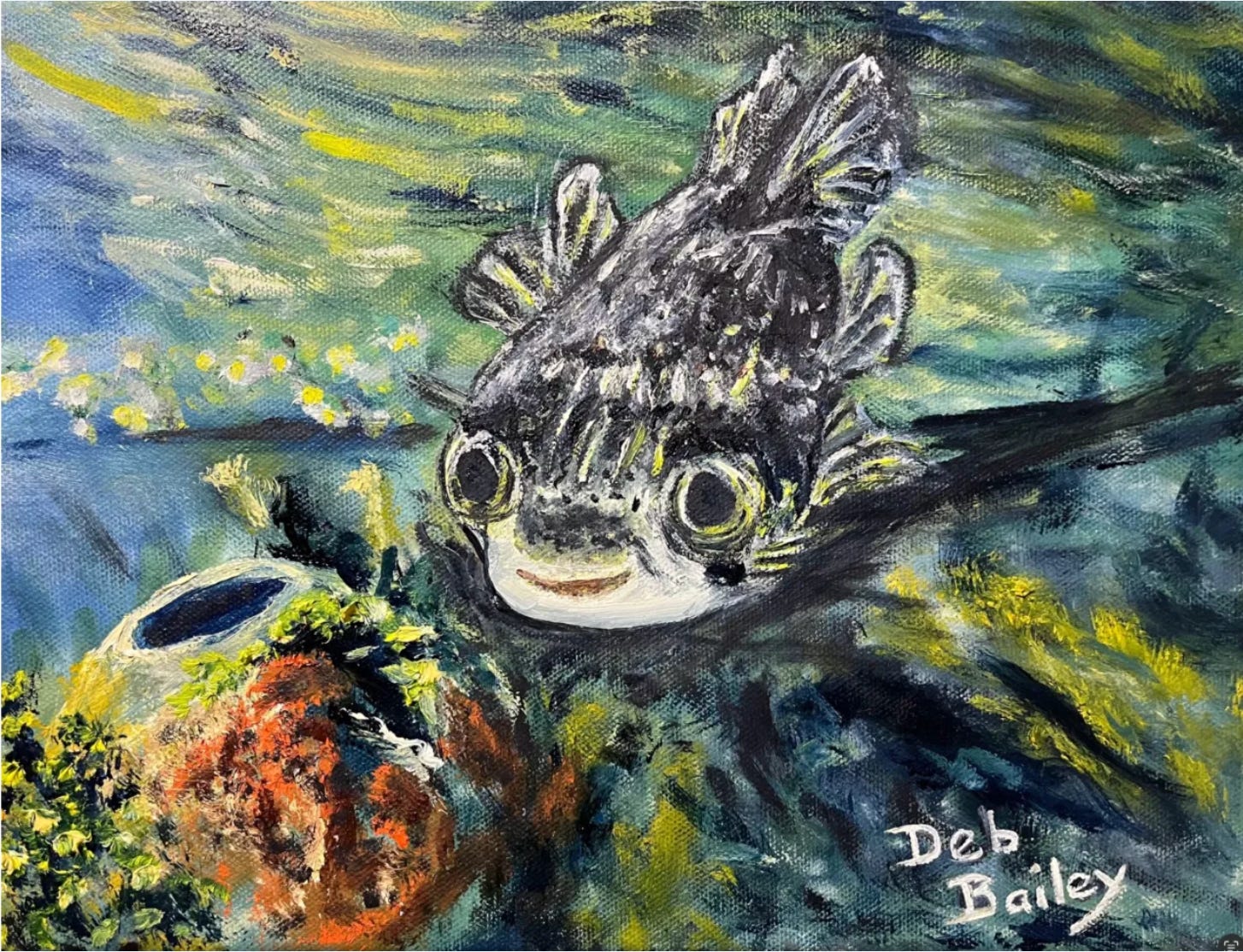 The painting is also part of the gift posts. While I worked at the museum, there was a small puffer fish in one of the aquariums. When I needed a moment’s break from things, I would stand by the tank. The puffer fish would always come right up to the window and hover there. I don’t know what it was thinking, but I hope it was happy. He seemed to linger longest whenever there was a group of happy children waving at him. So one day I took his picture and painted him. So, as part of this gift, I leave you with the puffer fish.