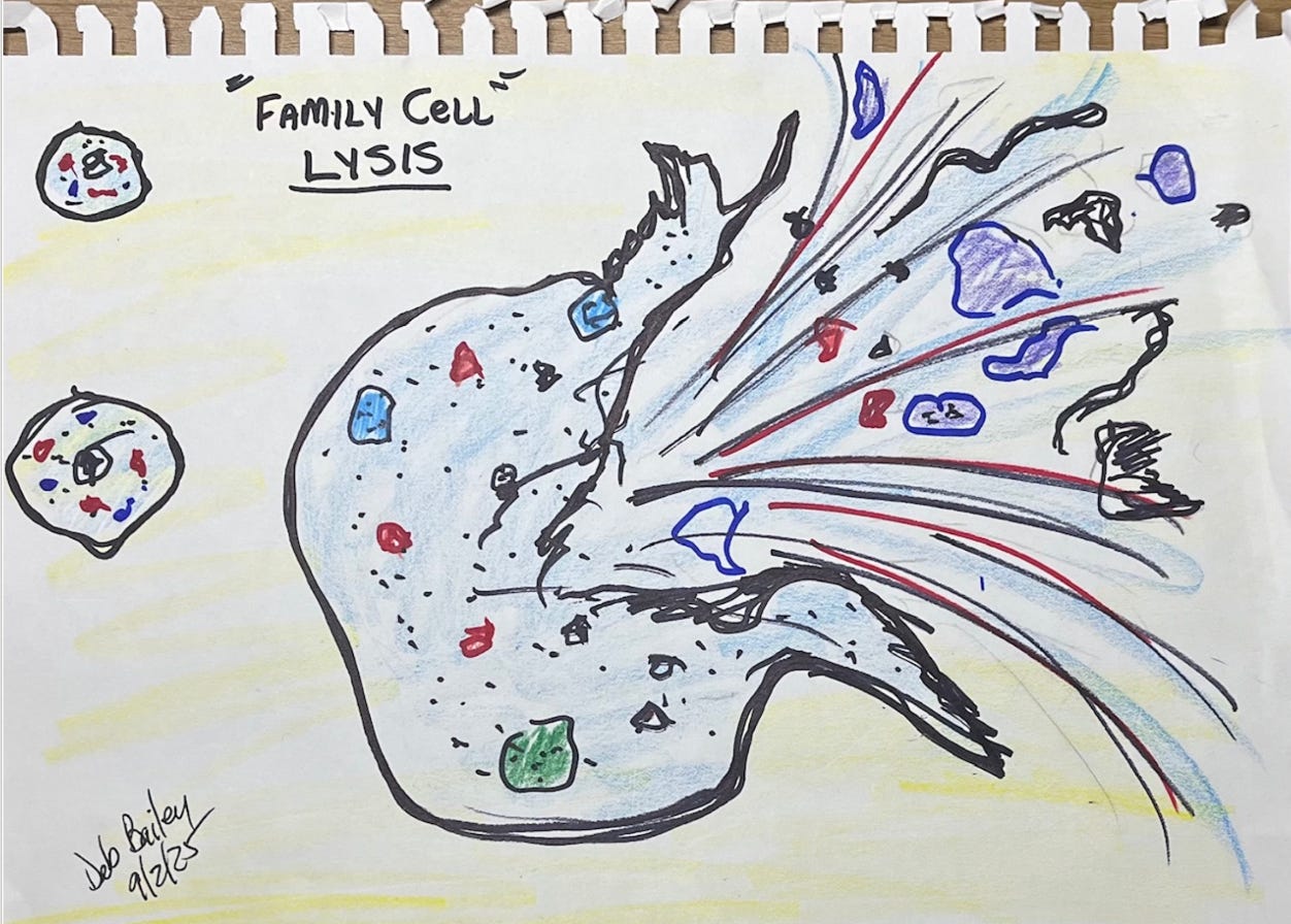 It was as if I had a kind of “family” connection again. “Family” had been the whole focus of my life and self-worth up until that point, and I was desperate. Lonely. Afraid. Mine had “lysed.” In biology, cell lysis is the death of a cell. It blows open, spews its guts everywhere, and there is nothing left. With my whole family world blown apart, I was reeling, and so I grabbed on to her support for dear life.