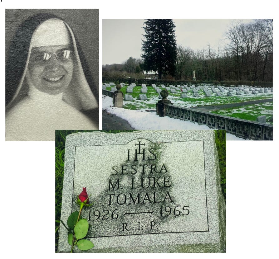 Whenever I visited Mom, I would always take her to visit my aunt’s grave. It was nearby, in the cemetery at the nuns’ motherhouse. I never forgot that 1965 phone call telling my mother her sister was dead. Or…my mother’s anguished cry that morning. While I didn’t remember a lot about my aunt, I remembered her peacefulness, joy, and kindness. And how much my mother missed her. So I always visited her grave, and left a rose for her and the other two nuns who died with her in that accident. Mom never said much either way, but she never stopped me, and always came with me.