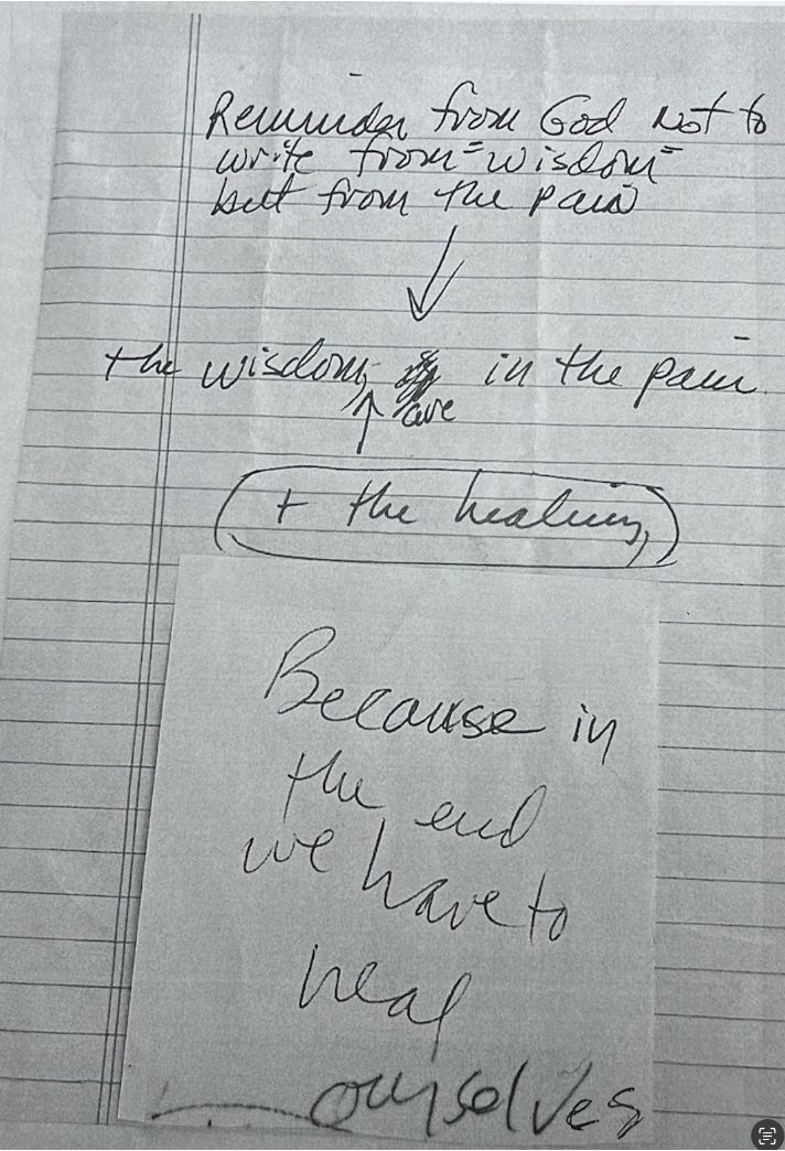 Don’t write from “wisdom” but from the pain. Words come last. It is the emotion that leads to the wisdom and healing, not the other way around.