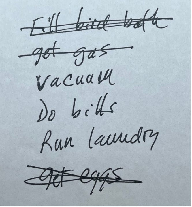 Now, in life, I am often an impatient, “bottom-line” person. Just give me the final takeaway. So of course, I LOVE “to-do” lists. I love itemizing every single thing I want to accomplish on a given day. Then, best of all, I revel in slashing a thick dark line through one of them as I complete a task.