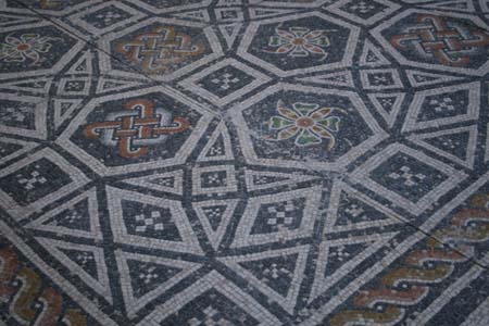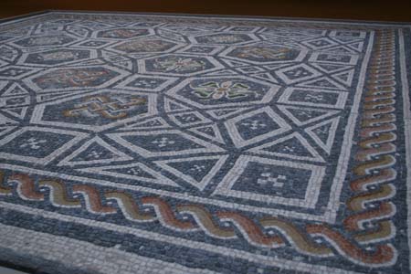 The museum’s website provides some information on the piece. It dates to about the 2nd century and is made of colored stones and green glass tiles arranged in geometric and floral patterns. The mosaic’s large size (98 1/2 x 98 1/2 in. / 250.3 x 250.3 cm) suggests it could have been in a house’s atrium and possibly covered a cistern where rainwater was collected. Since an atrium is a colonnaded court partially open to the air, rainwater would have fallen onto the mosaic floor before dropping into the cistern. Water flowing over the floor would have made the stones and glass pieces sparkle. The museum’s website contains a photograph of the entire mosaic along with a description: