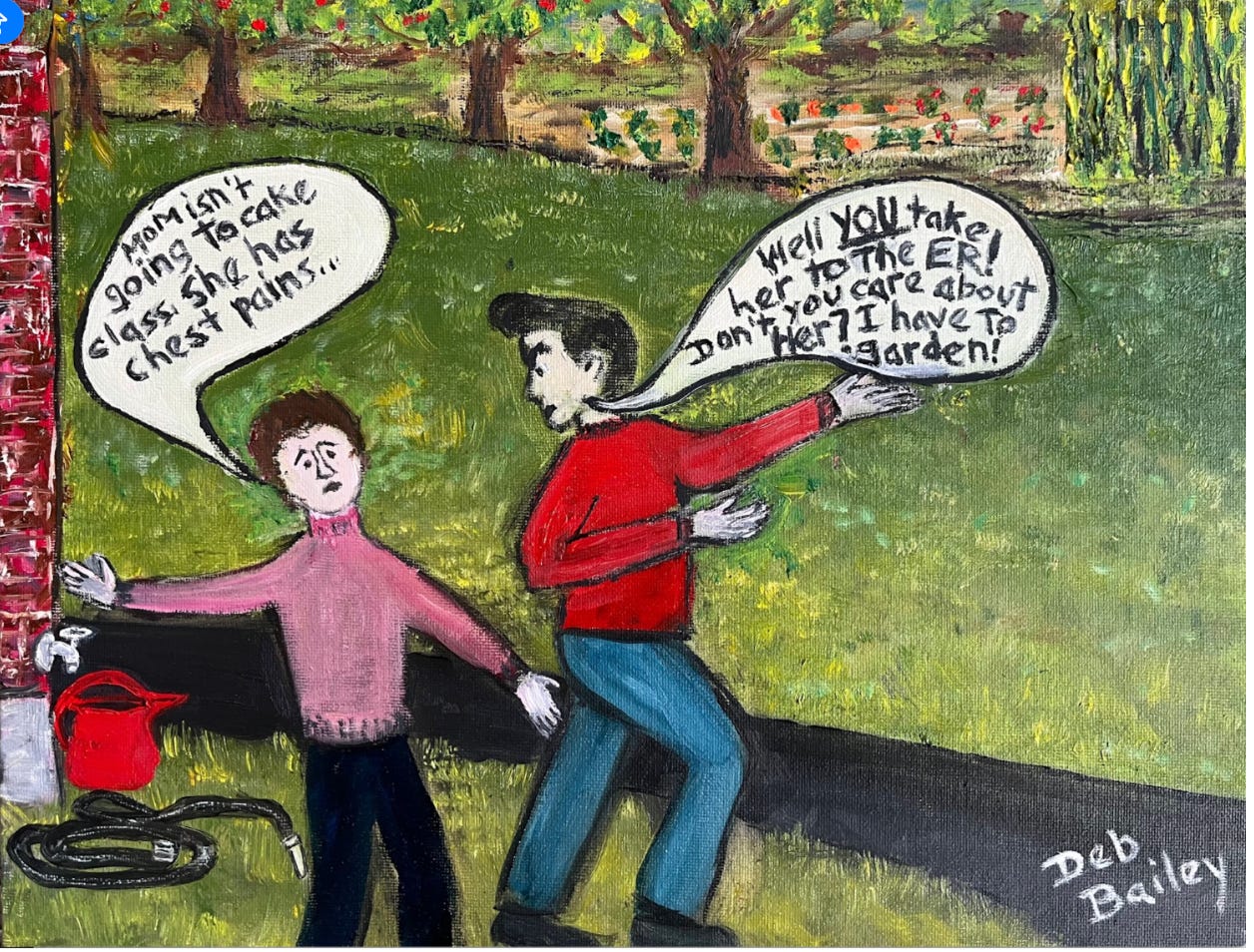 I was crushed. For starters, I didn’t think she was in any crisis. But still, with chest pains, who could be sure? Yet, here was my father, more worried about his damned garden than his wife. Why wasn’t he worried enough to join me at the hospital?