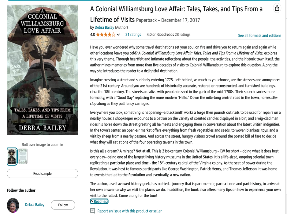 Bailey, Debra A., (2017) A Colonial Williamsburg Love Affair: Tales, Takes, and Tips From a Lifetime of Visits, Durham, NC: Intropak Publications
