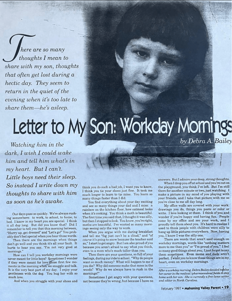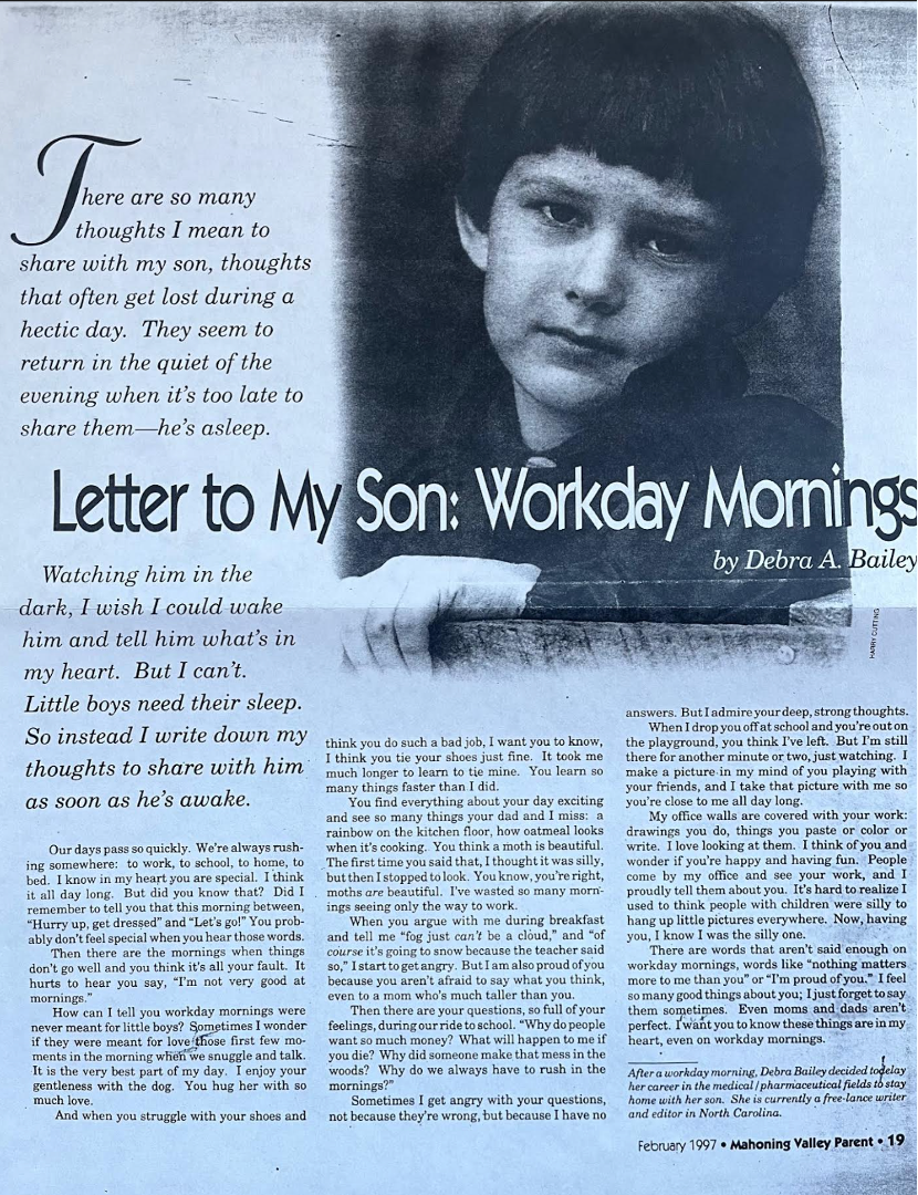 - Mahoning Valley Parent: “Letter to My Son: Workday Mornings (reprint), February, 1997