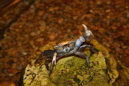 >> Crabs have to get oxygen when they are out of the water they will “chew” a small amount of water to mix it with air and get oxygen from this process, that is likely why your crab is foaming. He is waving his claws to show his territory and attract females, so he is not mad. …For a great website on crabs and other crustaceans check http://www.crusta10.de not sure if it is all in English, but the site owner is one of the most knowledgeable people on the subject. Good Luck, Oliver”