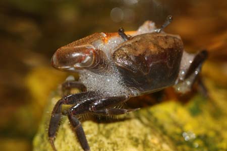 >> Crabs have to get oxygen when they are out of the water they will “chew” a small amount of water to mix it with air and get oxygen from this process, that is likely why your crab is foaming. He is waving his claws to show his territory and attract females, so he is not mad. …For a great website on crabs and other crustaceans check http://www.crusta10.de not sure if it is all in English, but the site owner is one of the most knowledgeable people on the subject. Good Luck, Oliver”
