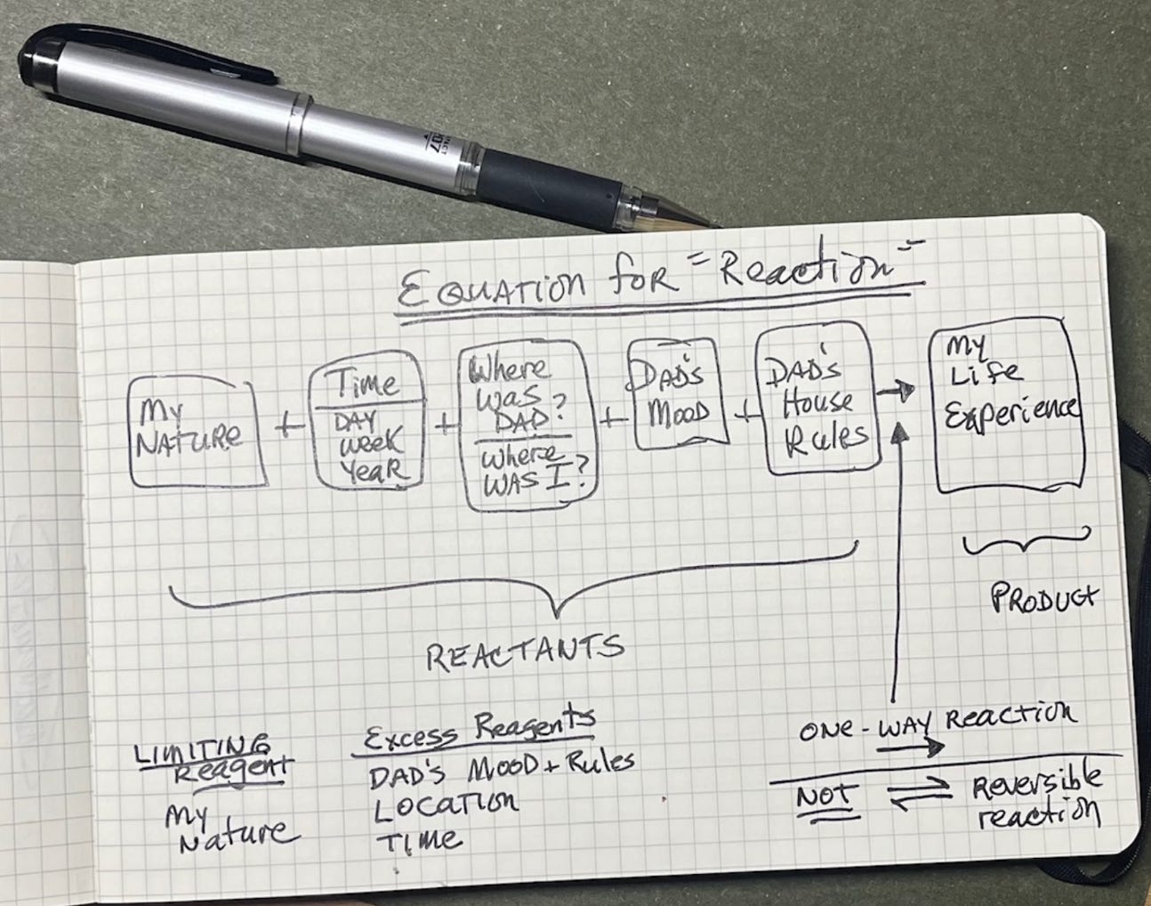 The bottom line is that my emotional energy would run out long before his. So I was the limiting reagent. He could control me and have his way with me, even when I tried to resist, because all he had to do was keep battering me with his reagents — his mood, twisting his house rules, picking fights with me and not leaving me alone. Since he had these infinite amounts, sooner or later, I would run out of fight out of sheer nervousness. I would have to cave because I just couldn’t stand it anymore.