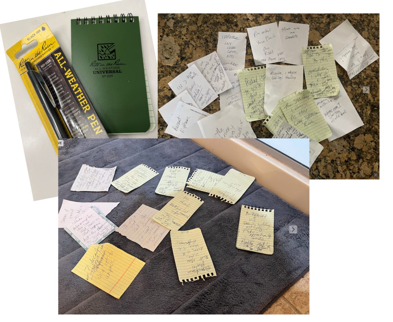 Aware that I can’t trust my memory to remember any of these things in my head until after my shower, I needed a way to capture them. Then I remembered that the nature researchers at the museum I taught at use waterproof field notebooks and pens to capture observations. So, I bought myself a package of “write in the rain” memo pads and a waterproof pen. And voila! I no longer have to worry about remembering.