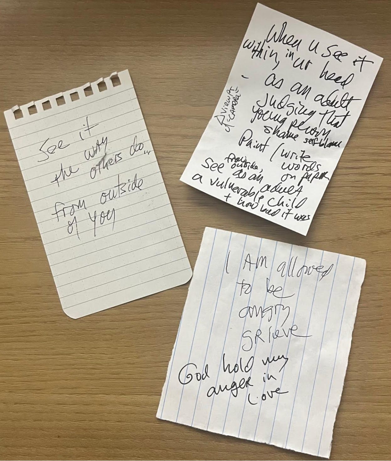 In the middle of today’s shower, these ideas flowed out about why I needed to get those images out onto paper, in paint, and words. The note about “anger and grief,” I will come back to another time. But the others were key thoughts for today: